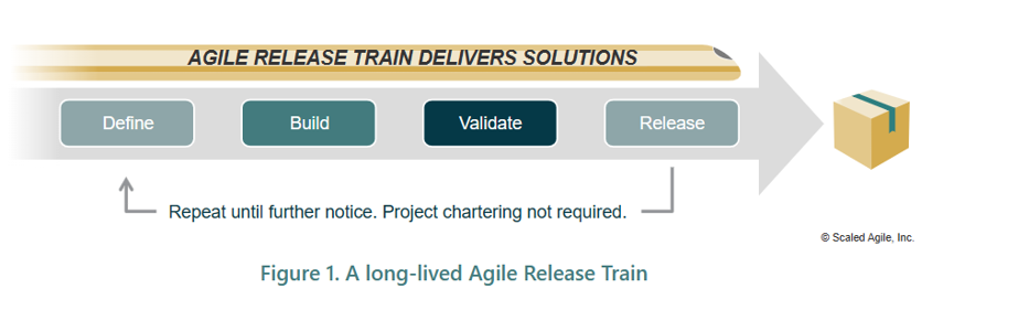 *L’Agile Release Train (ART) est une équipe de longue durée composée d’équipes agiles qui développent, livrent et souvent exploitent de manière progressive une ou plusieurs solutions dans un flux de valeur. Les ART sont des équipes d’équipes agiles qui se concentrent sur une mission commerciale et technologique commune. Chacun est une organisation virtuelle (généralement 50 à 125 personnes) qui planifie, s’engage, développe et déploie ensemble. Les ART sont organisés autour des principaux flux de valeur de développement de l’entreprise et existent uniquement pour concrétiser la promesse de cette valeur en construisant et en livrant des solutions bénéfiques pour le client. Les ART sont transversaux et possèdent toutes les compétences nécessaires pour définir, construire, valider, publier et, le cas échéant, exploiter des solutions. Ces capacités permettent à l’ART de fournir un flux continu de valeur.