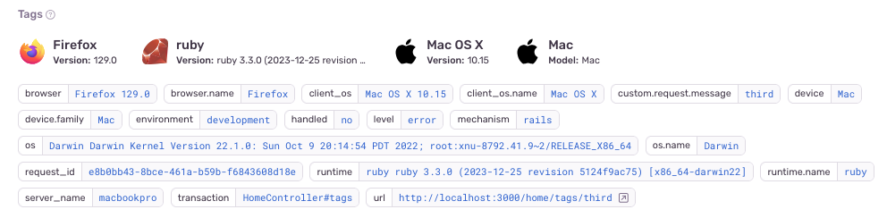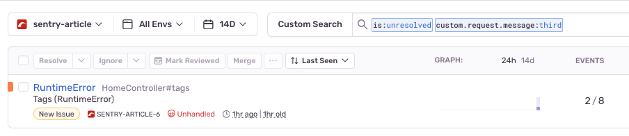 L’utilisation des tags ne pourrait pas être plus simple (attention, il existe des tags par défaut utilisés par Sentry d’où le préfixe custom.):