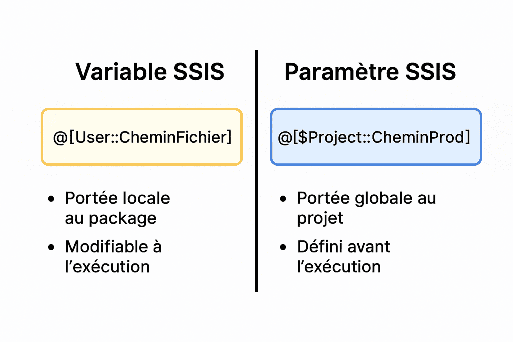 Évitez les valeurs codées en dur (chemins, noms de fichiers, chaînes de connexion). Utilisez des variables SSIS pour :