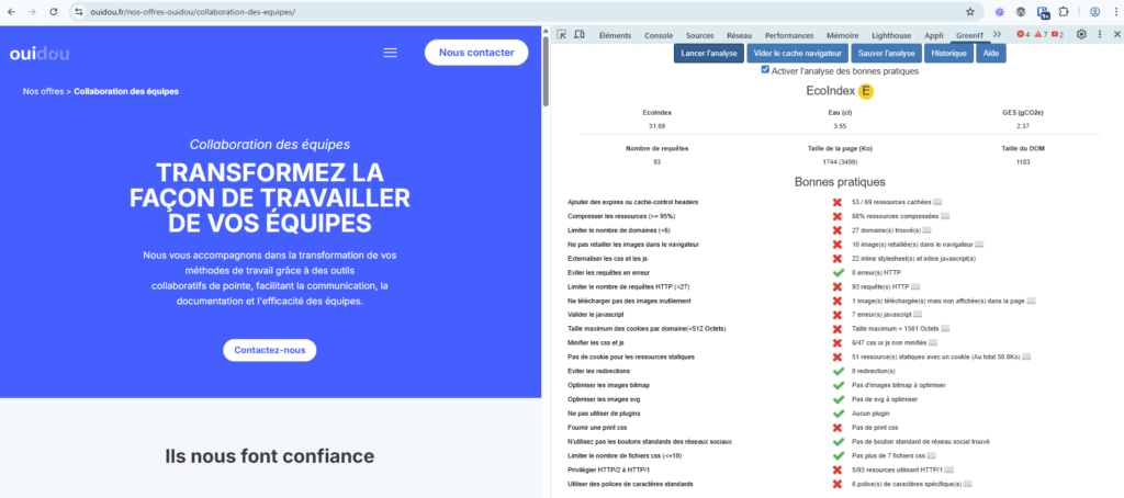 Pour ce faire, il existe des outils qui permettent de calculer l’empreinte carbone en tenant compte de la matrice énergétique du pays, du pourcentage d’énergies renouvelables utilisées et de l’empreinte carbone moyenne des sites de la région. Une solution existante est le site Ecoindex et l’extension GreenIt – Analyses qui fournissent un rapport sur la quantité de code inutilisé sur la page, le nombre d’images plus grandes que nécessaire et indiquent même les formats d’image qui pourraient être modifiés pour réduire la consommation d’énergie et les émissions de CO₂ lors du téléchargement. Ils vérifient également si l’hébergeur du site utilise de l’énergie renouvelable sur ses serveurs, en utilisant l’outil de The Green Web Foundation.